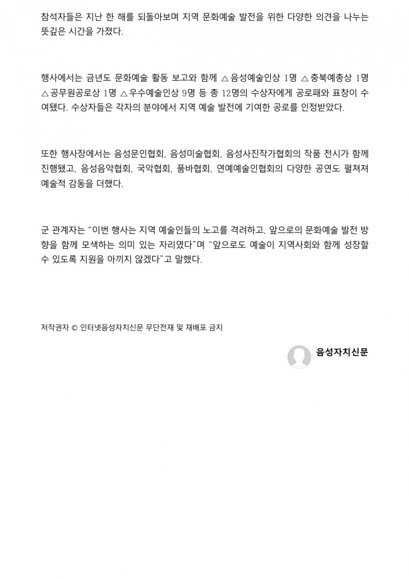 음성예총, ‘2025 음성예술인의 밤’ 개최(25.12.24 음성자치신문) 작성자 : 음성예총 | 작성일 : 26-01-05 15:01 | 조회 : 32회 본문 출처 : http://www.usjachi.com/news/articleView.html?idxno=32399 다음글“예술로 인생을 채색하다”…음성예총, ‘음성예술인의 밤’ 성료(25.12.23 음성타임즈) 26.01.05 목록