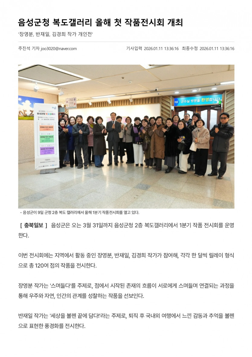음성군청 복도갤러리 올해 첫 작품전시회 개최(26.01.11 충북일보)