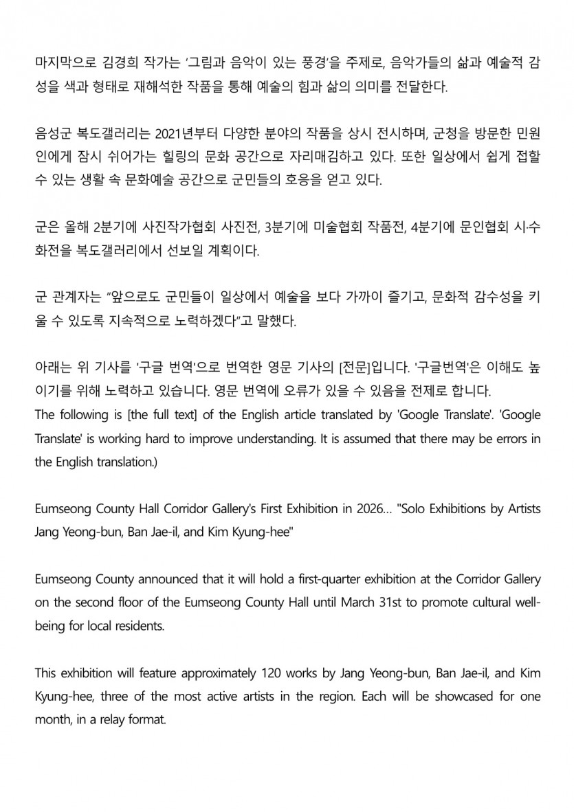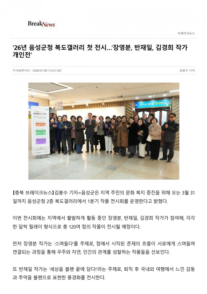 '26년 음성군청 복도갤러리 첫 전시…‘장영분, 반재일, 김경희 작가 개인전’(26.01.11 브레이크뉴스) 작성자 : 음성예총 | 작성일 : 26-01-27 11:59 | 조회 : 80회 본문 출처 : https://www.breaknews.com/1175578 이전글2026년 음성군청 복도갤러리 첫 전시 ··· ‘장영분, 반재일, 김경희 작가 개인전’(26.01.11 금강일보)(1) 26.01.27 다음글음성군청 복도갤러리, 새해 첫 전시회 운영(26.01.11 충청타임즈) 26.01.27 목록