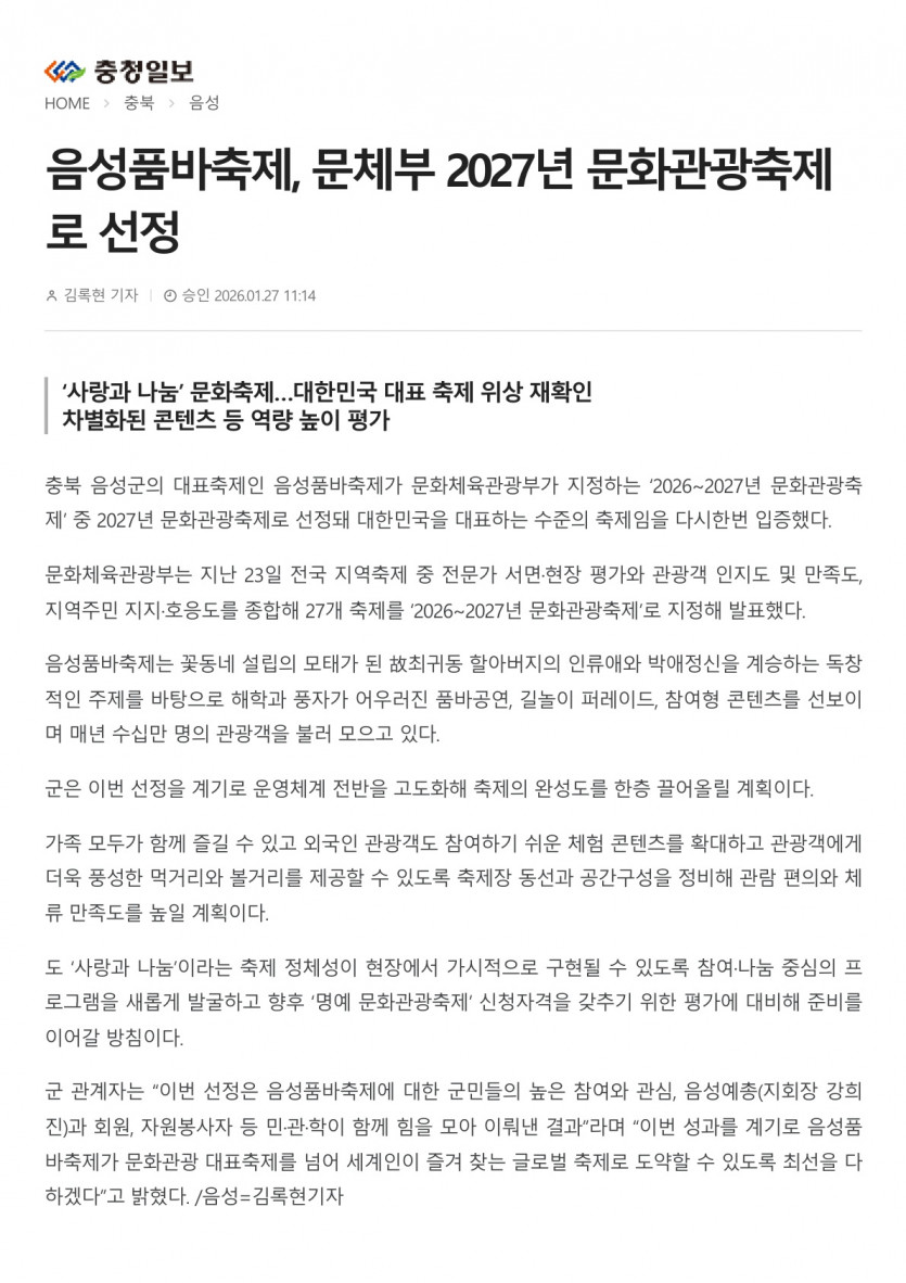 - 다음글‘음성품바축제’ 2027년 문화관광축제 선정… 국가대표 축제 입증(26.01.27 중부매일)(2) 26.01.27