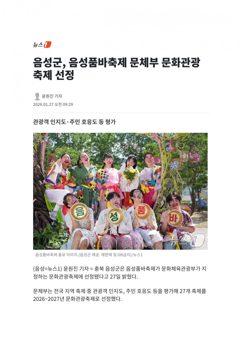 음성군, 음성품바축제 문체부 문화관광축제 선정(26.01.27 뉴스1)
