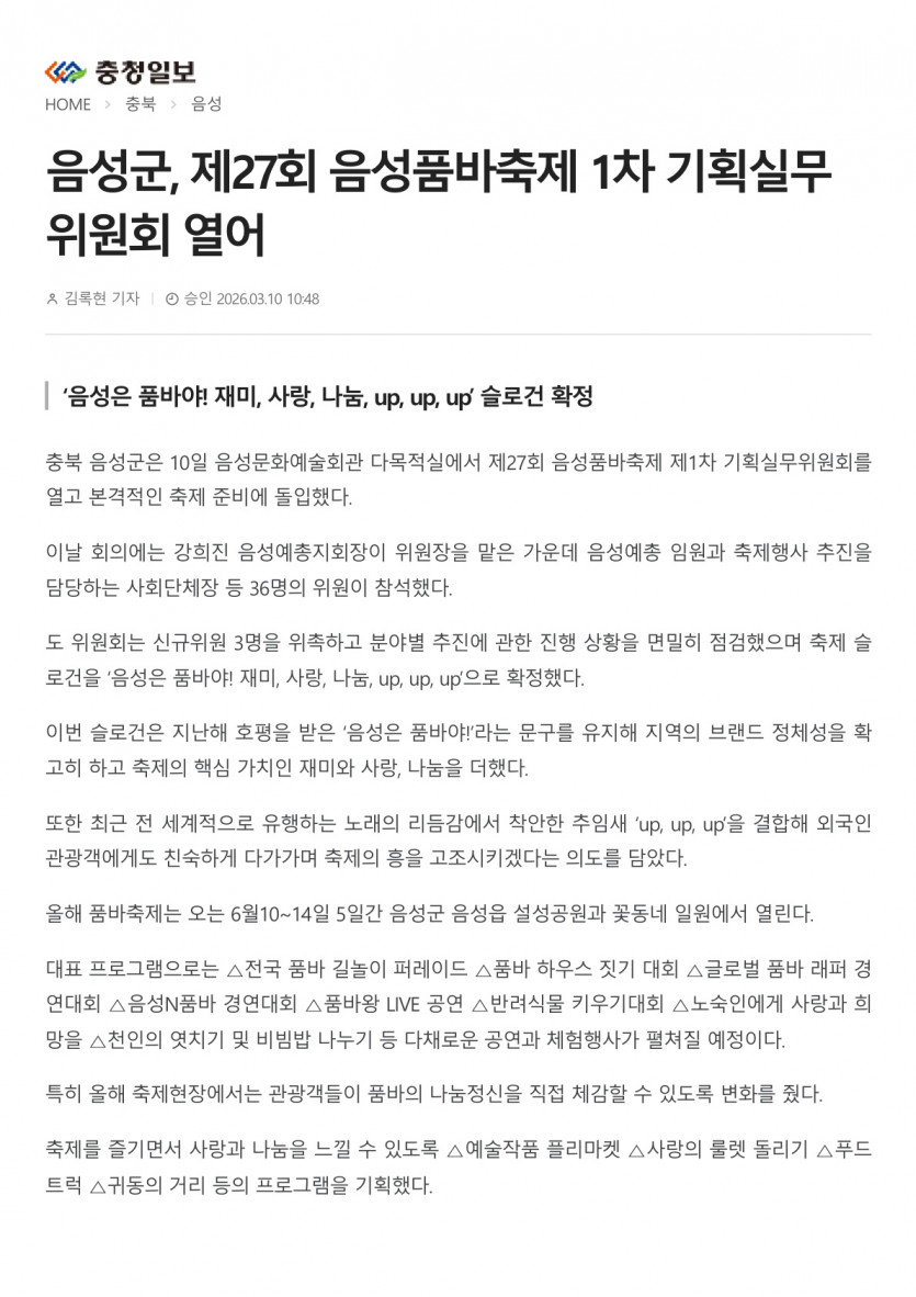 음성군, 제27회 음성품바축제 1차 기획실무위원회 열어(26.03.10 충청일보)