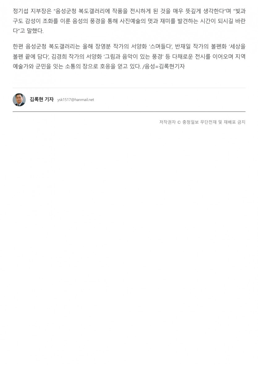 음성사진작가협회, 음성군청 복도갤러리서 전시(2026.04.05 충청일보) 작성자 : 음성예총 | 작성일 : 26-04-16 11:53 | 조회 : 3회 본문 출처 : https://www.ccdailynews.com/news/articleView.html?idxno=2408003 이전글군청 복도에서 만나는 ‘빛의 음성’… 음성군, 2분기 갤러리 전시 개막(2026.04.05 충청매일) 26.04.16 다음글음성군청 갤러리 2분기 전시 ‘빛으로 읽는 음성’ 개최(2026.04.03 이뉴스투데이) 26.04.16 목록