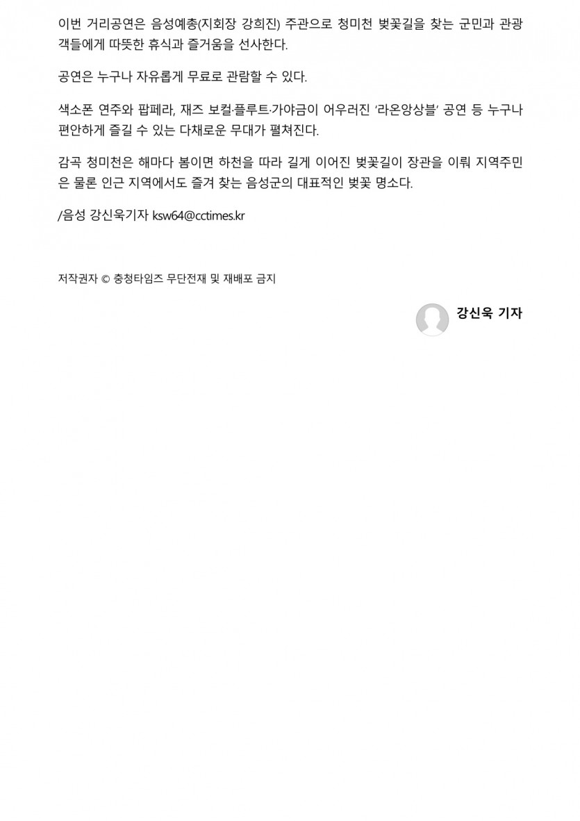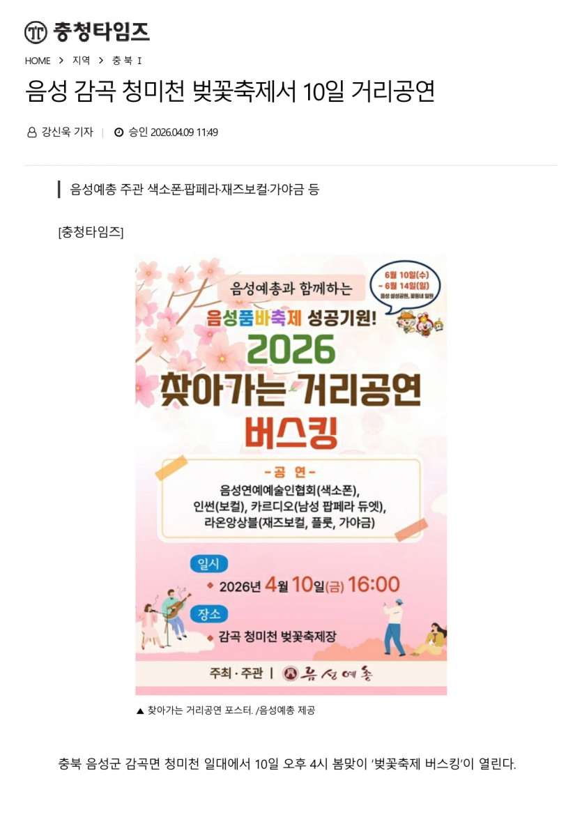 음성 감곡 청미천 벚꽃축제서 10일 거리공연(2026.04.09 충청타임즈)