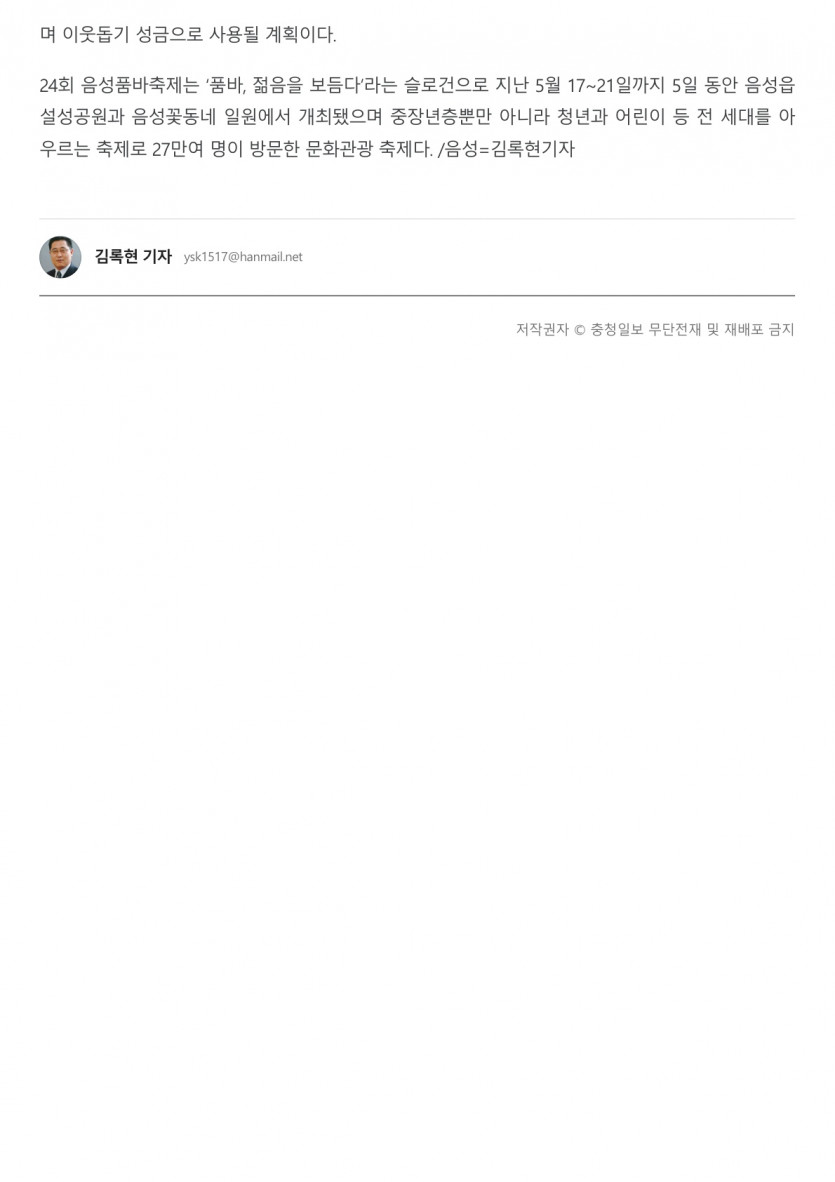 - 다음글24회 음성품바축제 성료...흥겨운 행사 열려 27만여명 찾아 [ 2023.05.22 ] 25.09.18