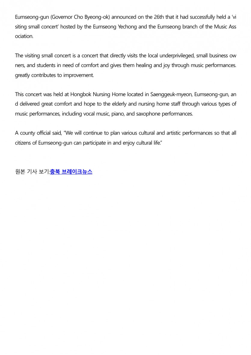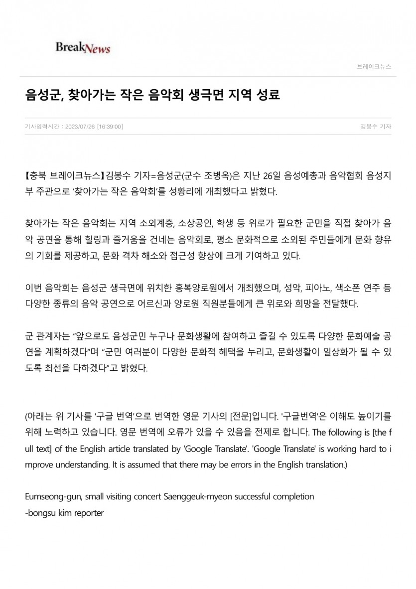 음성군, 찾아가는 작은 음악회 생극면 지역 성료 [ 2023.07.26 ]