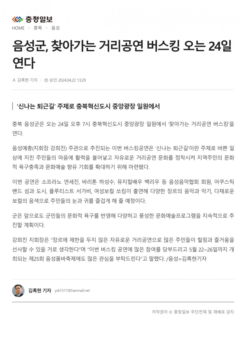 음성군, 찾아가는 거리공연 버스킹 오는 24일 연다