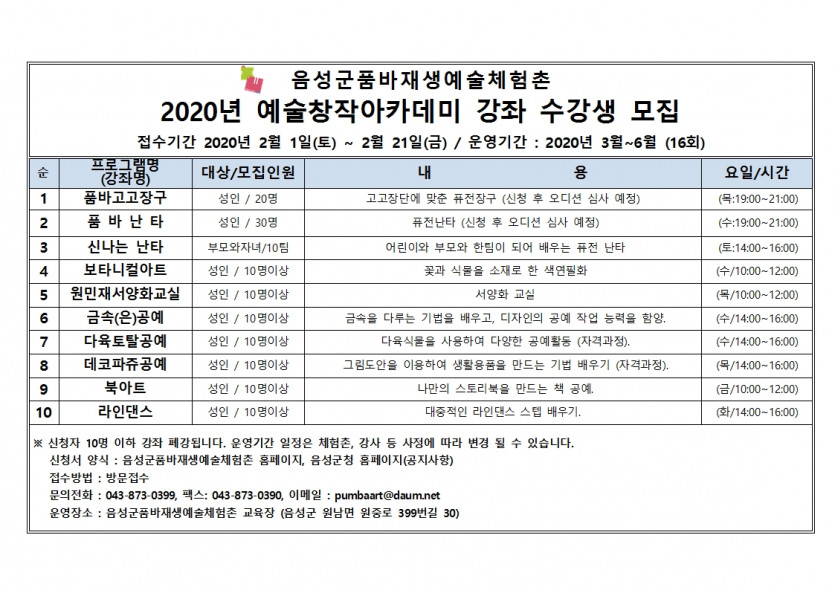 2020 음성품바재생예술체험촌 예술창작아카데미 강좌 수강생을 붙임과 같이 모집하오니 참고하시어 신청하여 주시길 바랍니다.